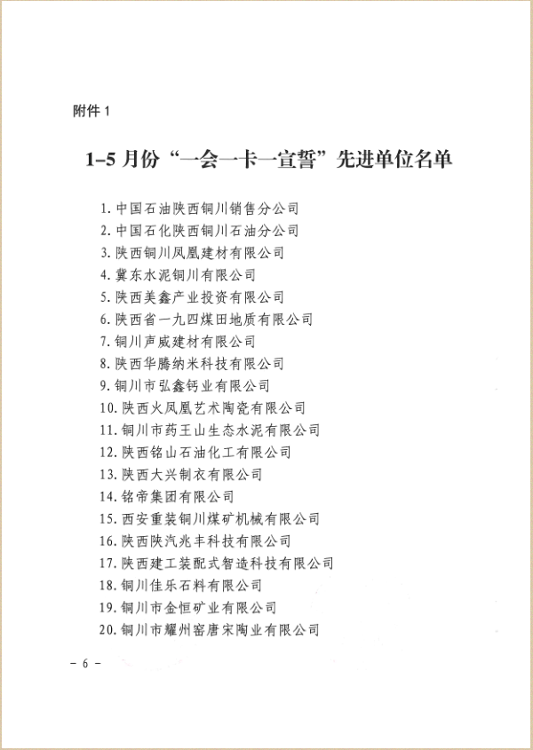 此次公司荣获铜川市1-5月份“一会一卡一宣誓”先进单位,公司员工吴进军荣获“一会一卡一宣誓”先进个人称号,是对公司安全生产工作的充分肯定,也是公司全体职工弘扬奋进精神、矢志艰苦创业的一个缩影,公司全体职工将继续立足岗位、埋头苦干,为公司持续快速发展和集团高质量发展贡献力量。